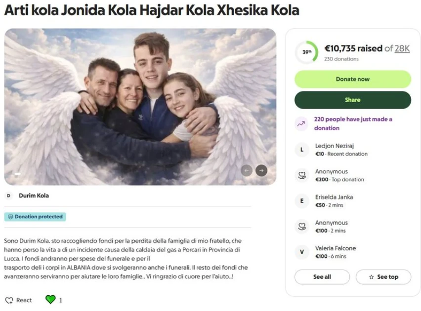 “Unë jam Durim Kola. Jam duke mbledhur fonde për humbjen e familjes së vëllait tim, të cilët humbën jetën si pasojë e një aksidenti të shkaktuar nga kaldaja e gazit në Porcari, në Provincën e Luccës. Fondet do të përdoren për shpenzimet e funeralit dhe për transportin e trupave në SHQIPËRI, ku do të zhvillohen edhe ceremonitë mortore. Pjesa e mbetur e fondeve do të shërbejë për të ndihmuar familjet e tyre”, thuhet në mesazhin e vëllait të Arti Kolës, Durim Kola.