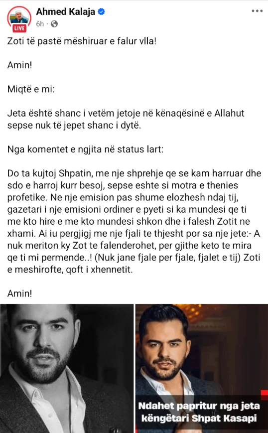Imami i xhamisë së “Dine Hoxhës” në Tiranë, Ahmed Kalaja, ka bërë një dedikim prekës, duke sjellë në vëmendje anën e fortë shpirtërore të artistit.