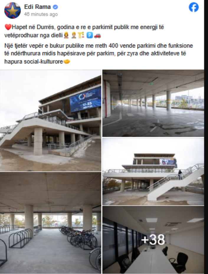 “Hapet në Durrës, godina e re e parkimit publik me energji të vetëprodhuar nga dielli. Një tjetër vepër e bukur publike me rreth 400 vende parkimi dhe funksione të ndërthurura midis hapësirave për parkim, për zyra dhe aktiviteteve të hapura social-kulturore”, shkruan ai.