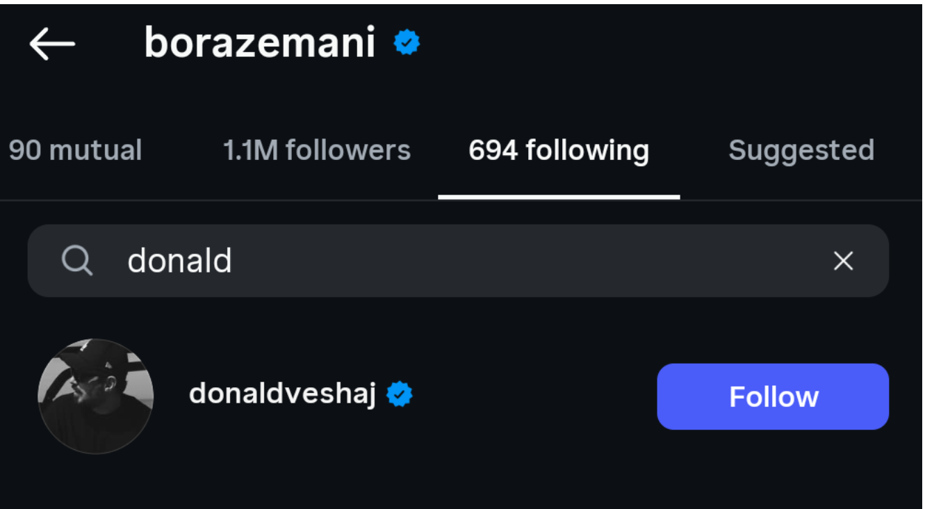Megjithatë, një verifikim i shpejtë tregon se ky informacion nuk qëndron. Si Bora, ashtu edhe Donaldi, vazhdojnë të jenë në listën e ndjekësve të njëri-tjetrit në platformën e Instagramit.