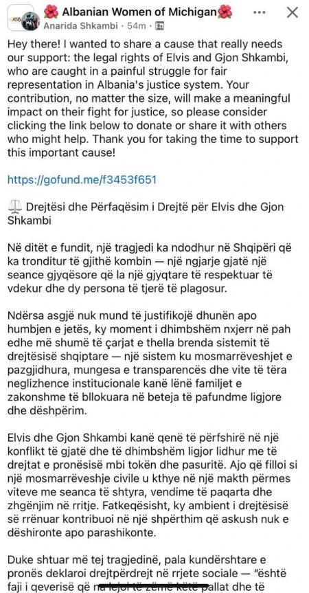 Kjo sepse së fundmi është është hapur edhe një GoFundMe me qëllim mbledhjen e fondeve për autorët e krimit, Elvis dhe Gjon Shkambi, nën sloganin “Support for legal rights for all”.