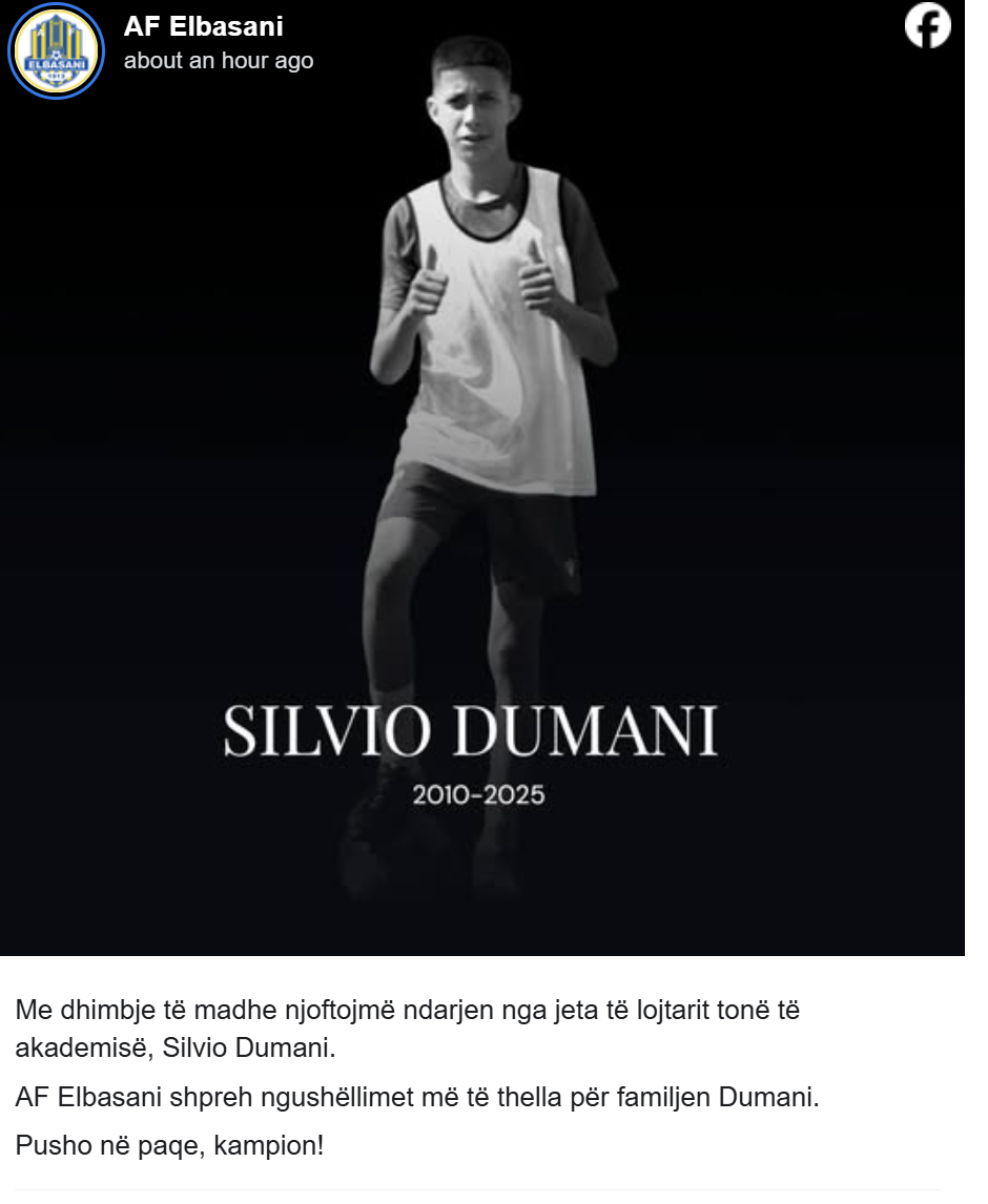 Klubi i Elbasanit përmes postimit në rrjetet social ka informuar se lojtari i tyre Silvio Dumani ka ndërruar jetë në moshën 15-vjeçare.