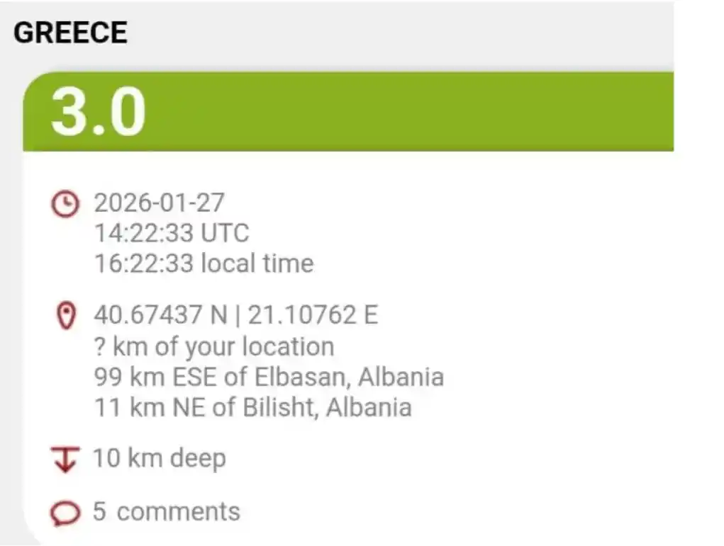 Dy lëkundje tërmeti janë ndjerë këtë të martë në qytetin e Bilishtit dhe në Korçë, duke shkaktuar panik te banorët e këtyre dy qyteteve.