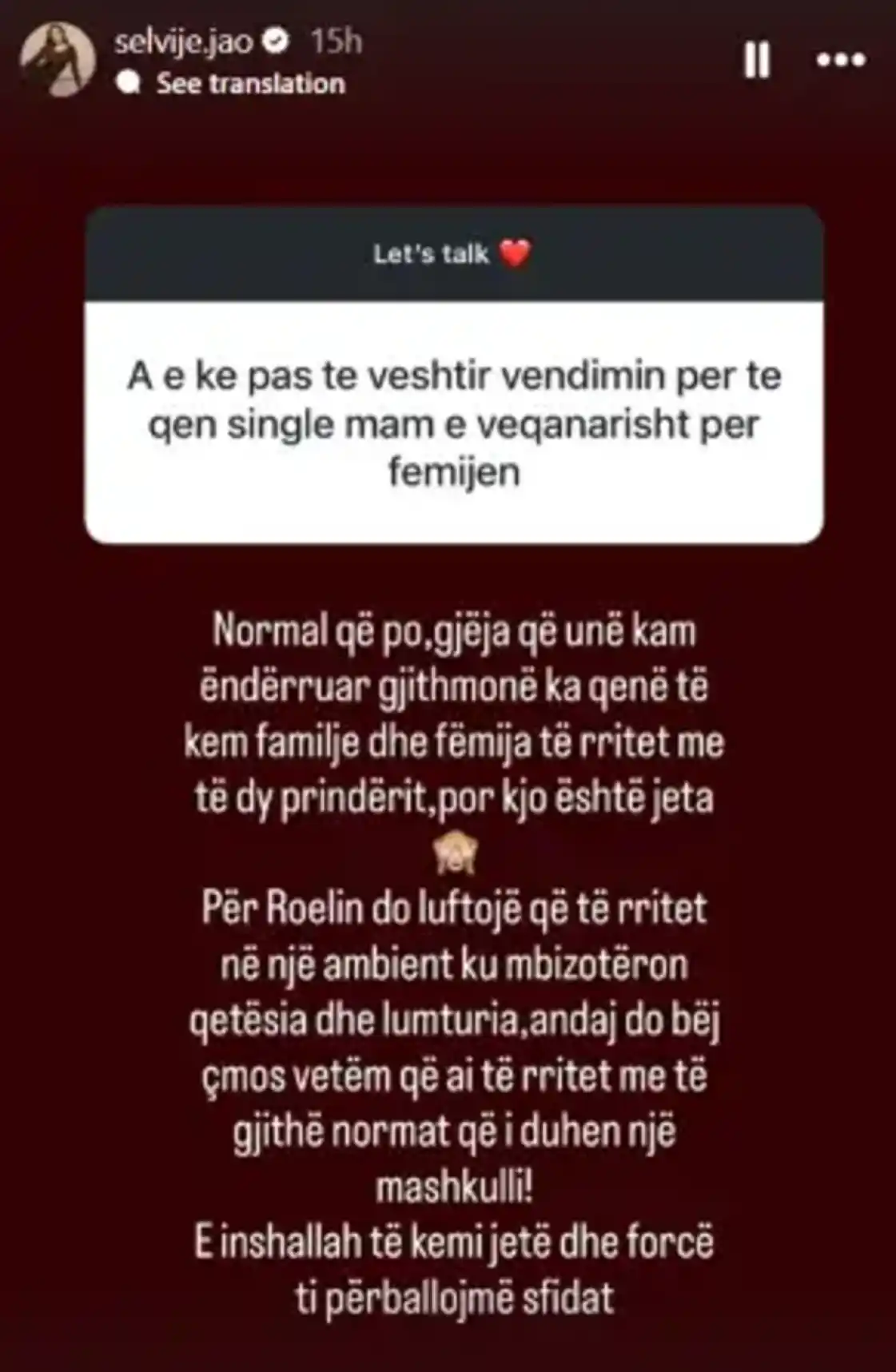 Ndërsa Selvije Jao u përgjigj: “Normal që po, gjëja që unë kam ëndërruar gjithmonë ka qenë të kem familje dhe fëmija të rritet me të dy prindërit, por kjo është jeta.