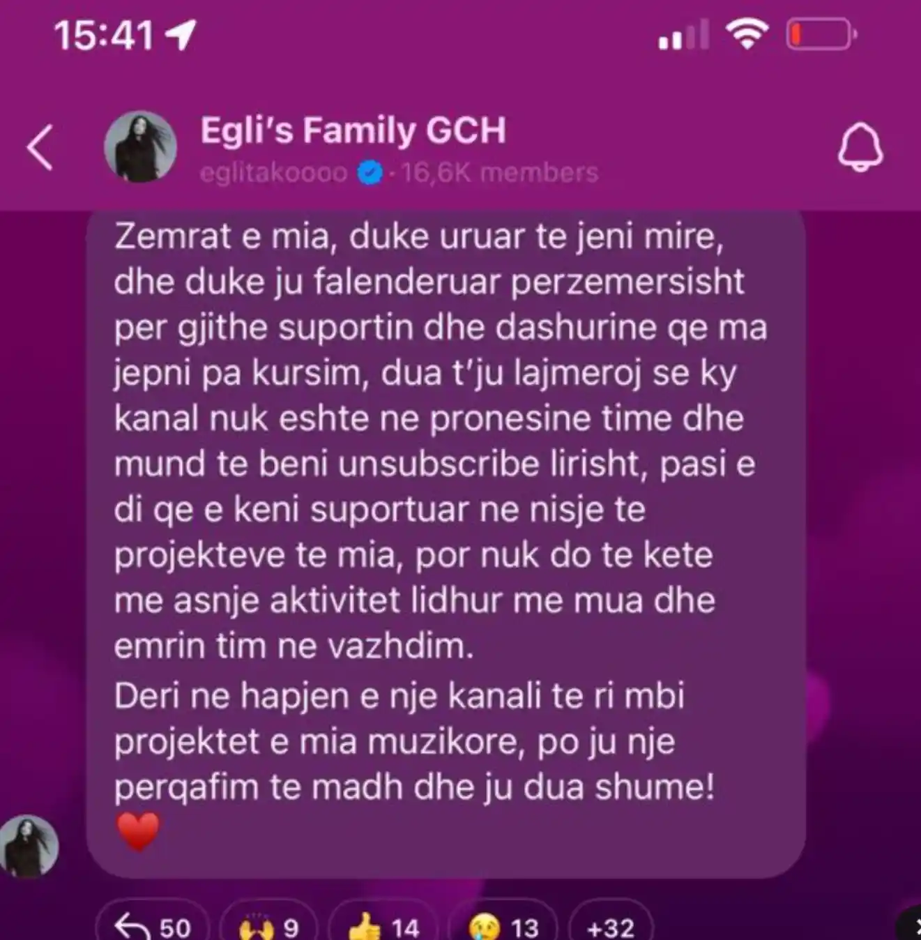 Ky njoftim tregon qartë se Egli ka vendosur të distancohet nga kanali aktual për arsye pronësie, duke shprehur mirënjohje për fansat.