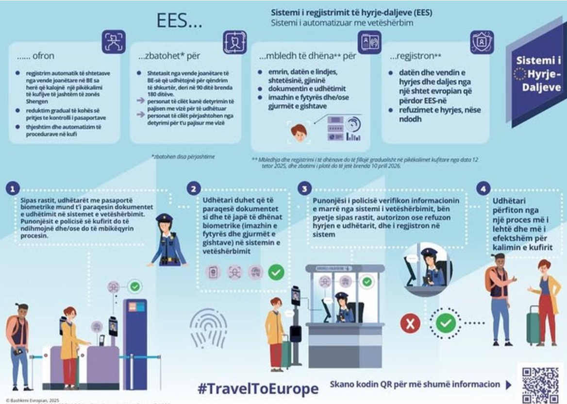 Nga data 12 tetor 2025, një sistem i ri i menaxhimit të kufijve, Sistemi i Hyrje/Daljes (Entry/Exit System), do të fillojë gradualisht të regjistrojë: të dhënat nga dokumenti i udhëtimit, datat e mbërritjes dhe të largimit, të dhënat biometrike (shenjat e gishtave dhe imazhi i fytyrës)